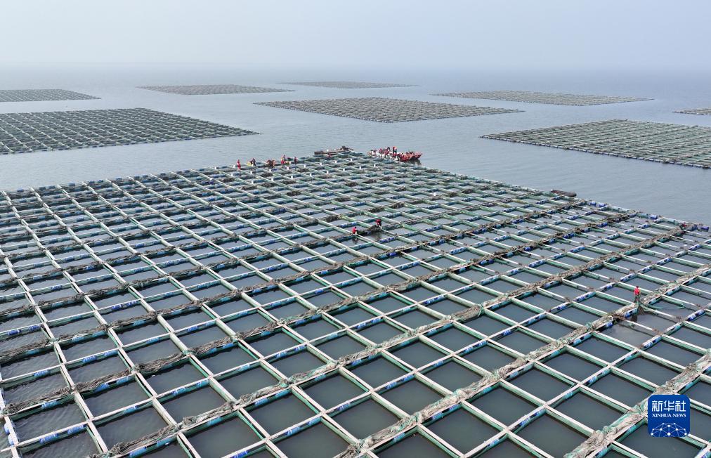 11月6日,河北省唐山市曹妃甸區一家深海網(wǎng)箱海參養殖合作社的社員在捕撈海參(無(wú)人機照片)。