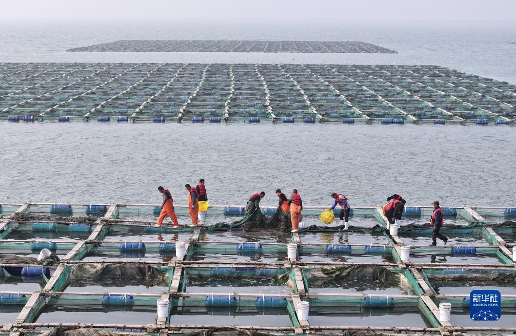 11月6日,河北省唐山市曹妃甸區一家深海網(wǎng)箱海參養殖合作社的社員在捕撈海參(無(wú)人機照片)。