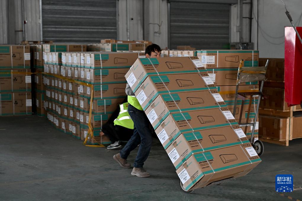 11月4日,在阿拉山口綜合保稅區內的跨境電子商務(wù)分揀清關(guān)中心,工作人員將國產(chǎn)空調裝車(chē)準備運往國外。