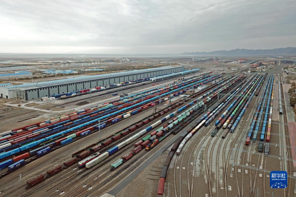 這是在阿拉山口站編組場(chǎng)拍攝的集結待發(fā)的貨運列車(chē)(無(wú)人機照片,11月4日攝)。