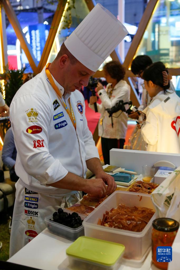 11月6日,來(lái)自第六屆進(jìn)博會(huì )國家展塞爾維亞展臺的工作人員在展會(huì )現場(chǎng)制作塞爾維亞特色美食。