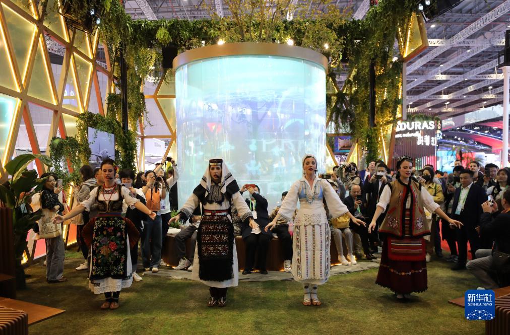 11月6日,在第六屆進(jìn)博會(huì )國家展塞爾維亞展臺,參觀(guān)者在觀(guān)看舞蹈。