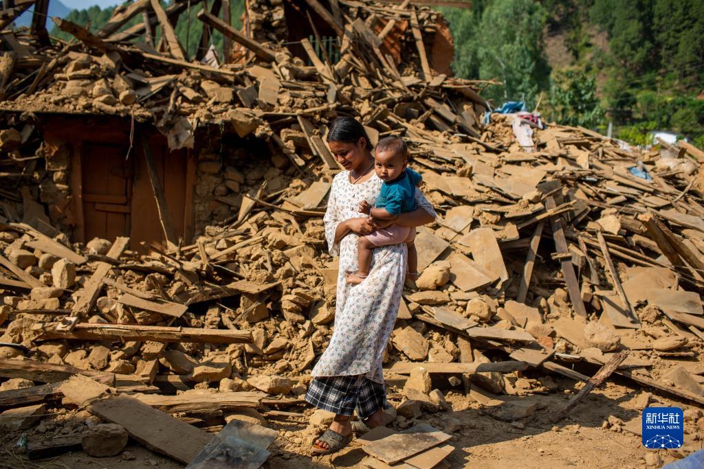 11月6日,在尼泊爾西部扎澤爾果德地震災區,一名女子抱著(zhù)孩子從建筑物廢墟前走過(guò)。