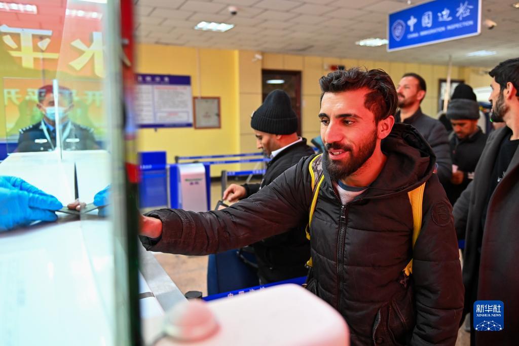 在新疆紅其拉甫口岸聯(lián)檢大廳,紅其拉甫邊檢站民警為出境旅客辦理邊檢手續(11月6日攝)。