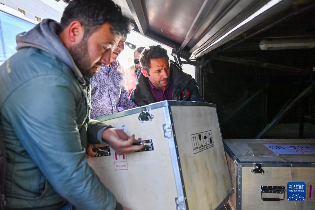 在新疆紅其拉甫口岸,出境旅客將行李搬上國際道路旅客班車(chē)(11月6日攝)。