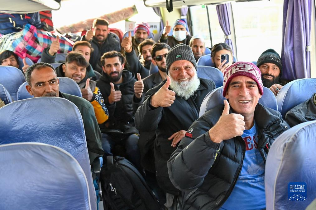 在新疆紅其拉甫口岸,出境旅客在國際道路旅客班車(chē)上等待發(fā)車(chē)(11月6日攝)。