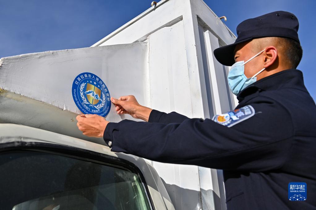在新疆紅其拉甫口岸,紅其拉甫邊檢站民警對出境車(chē)輛張貼標識(11月6日攝)。