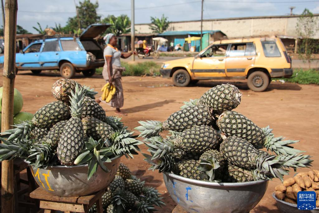 這是10月23日在貝寧“甜面包”菠蘿主產(chǎn)區澤鎮拍攝的水果攤上的菠蘿。