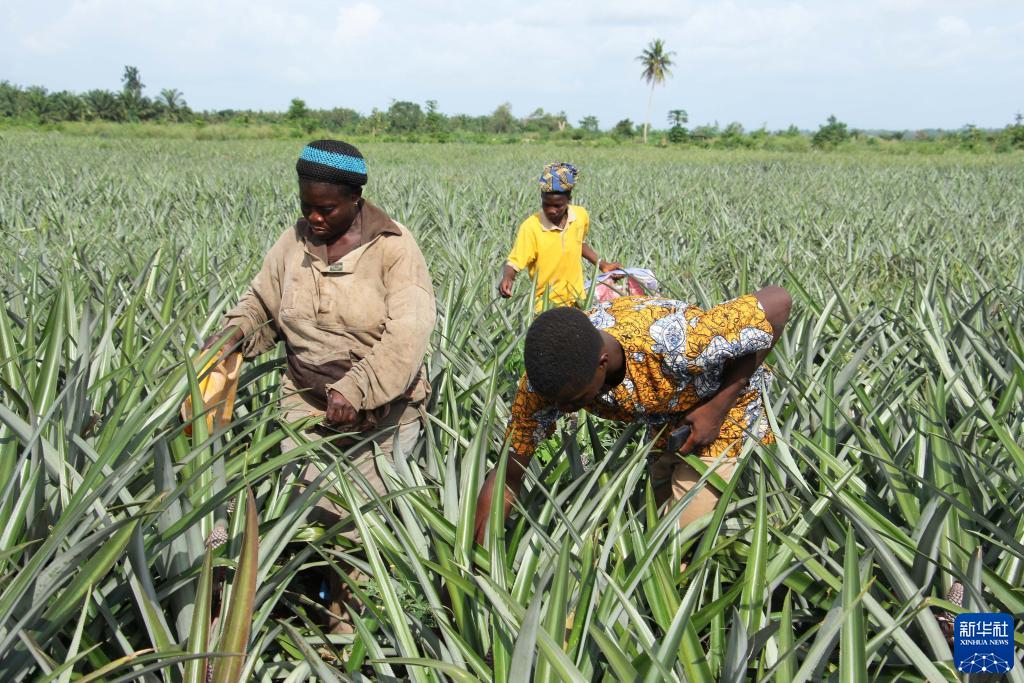 10月23日,農民在貝寧“甜面包”菠蘿主產(chǎn)區澤鎮的一片菠蘿田里勞作。