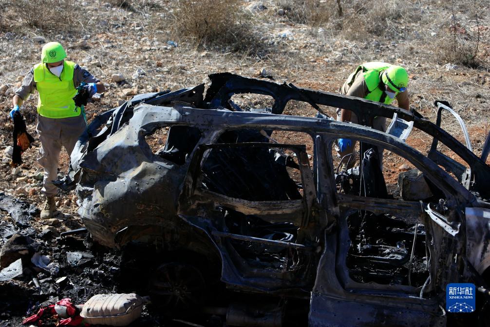 11月6日,在黎巴嫩南部艾納塔,工作人員檢查被以色列無(wú)人機炸毀的車(chē)輛殘骸。