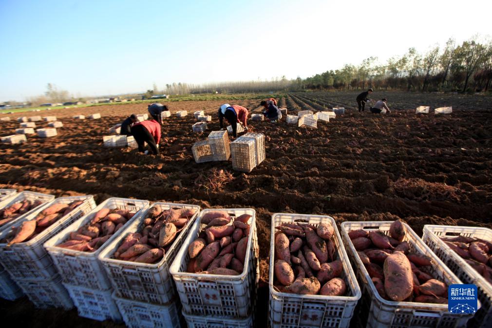 11月7日,在山東省臨沂市平邑縣地方鎮黃城村,農民在田間收獲晚茬紅薯。