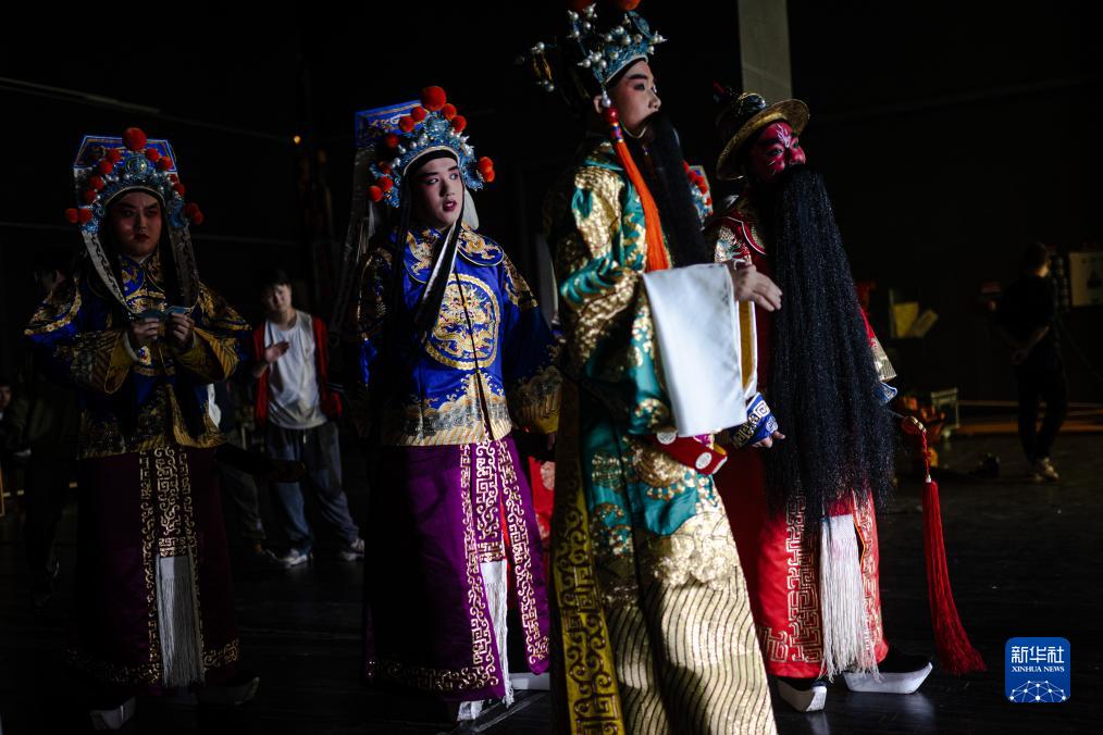 10月28日,楚劇演員艾子竣、張子涵、王超 、何汶杰(從右至左)在臺邊候場(chǎng),等待出演《秦瓊表功》。