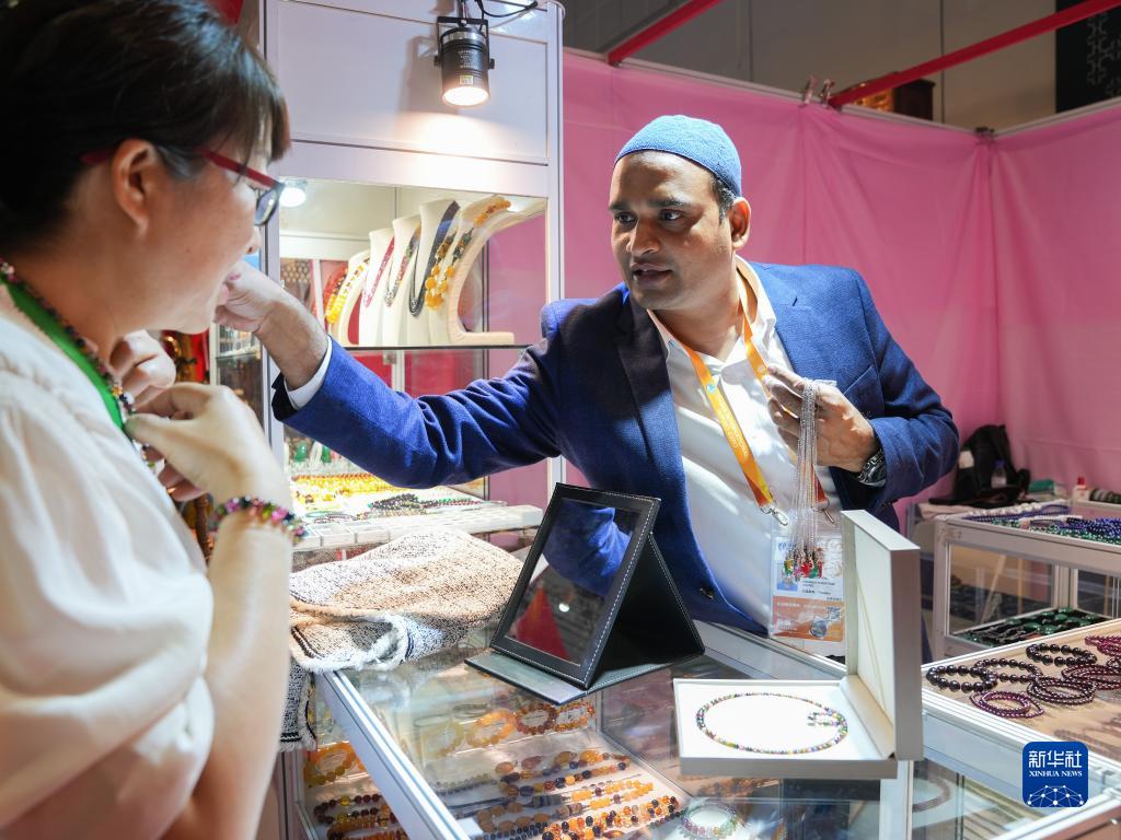11月7日,在第六屆進(jìn)博會(huì )消費品展區,一名來(lái)自巴基斯坦的展商向參觀(guān)者介紹項鏈。