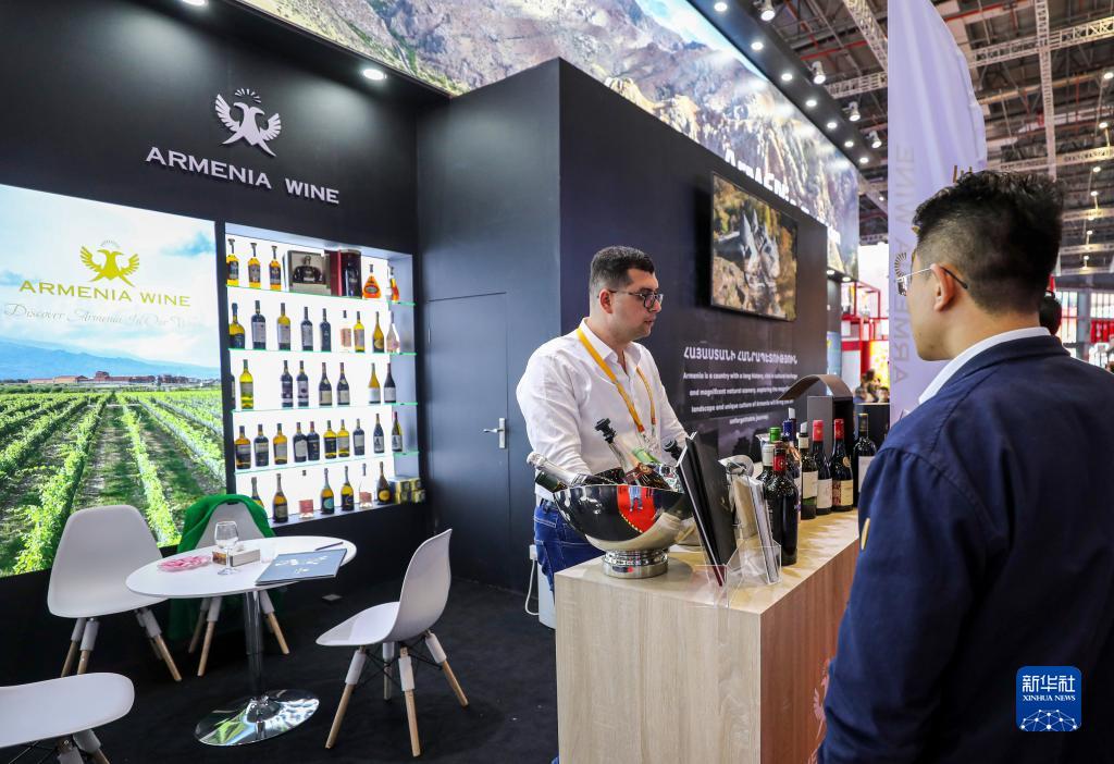 11月7日,參觀(guān)者在第六屆進(jìn)博會(huì )國家展亞美尼亞展臺咨詢(xún)亞美尼亞紅酒。