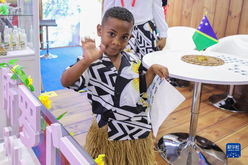 11月6日,一名來(lái)自所羅門(mén)群島的小朋友在第六屆進(jìn)博會(huì )國家展所羅門(mén)群島展臺打招呼。