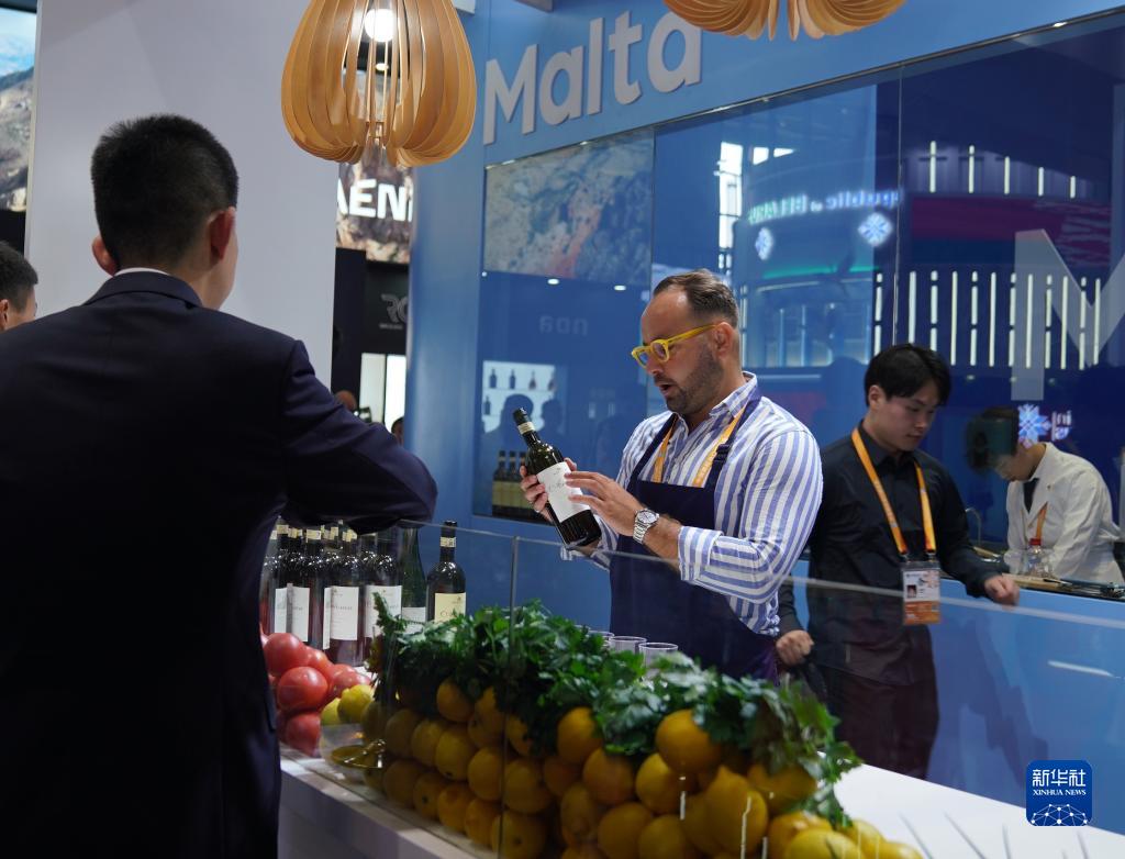 11月5日,展商在第六屆進(jìn)博會(huì )國家展馬耳他展臺介紹馬耳他紅酒。