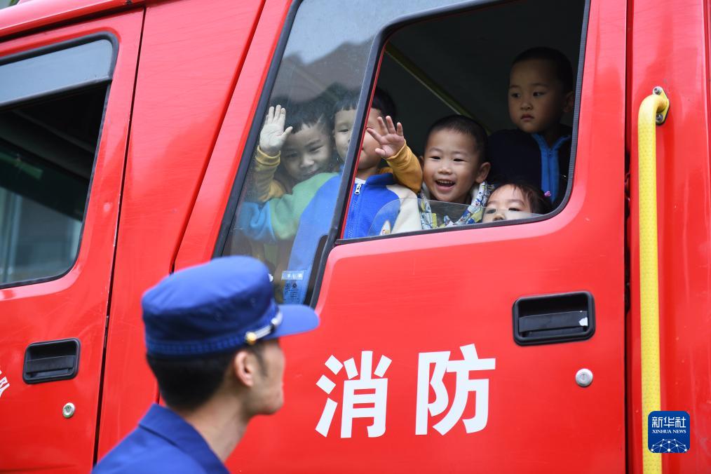 11月7日,四川省閬中市溫嶺幼兒園的小朋友登上消防車(chē)體驗。