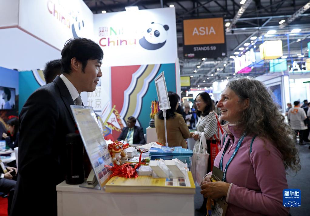 11月6日,一名女子在英國倫敦世界旅游交易會(huì )中國展區與工作人員交流。
