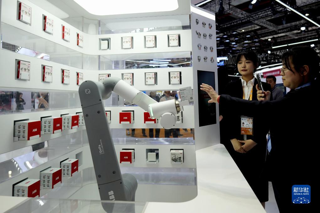 11月7日在第六屆進(jìn)博會(huì )技術(shù)裝備展區ABB展臺拍攝的機器人。