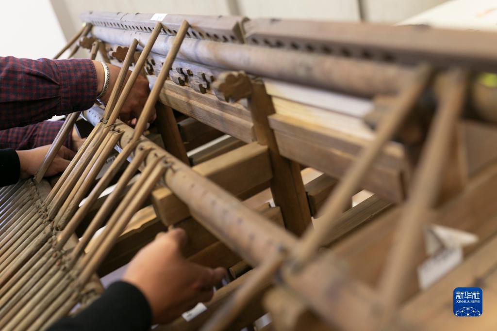 10月16日,在斯洛文尼亞盧布爾雅那的民族志博物館,故宮博物院專(zhuān)家修復中國古建筑木質(zhì)大門(mén)模型。