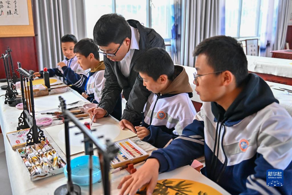 在新疆阿克陶縣雪松中學(xué),“紅杜鵑”國畫(huà)社團的學(xué)生在老師的指導下練習繪畫(huà)(11月7日攝)。