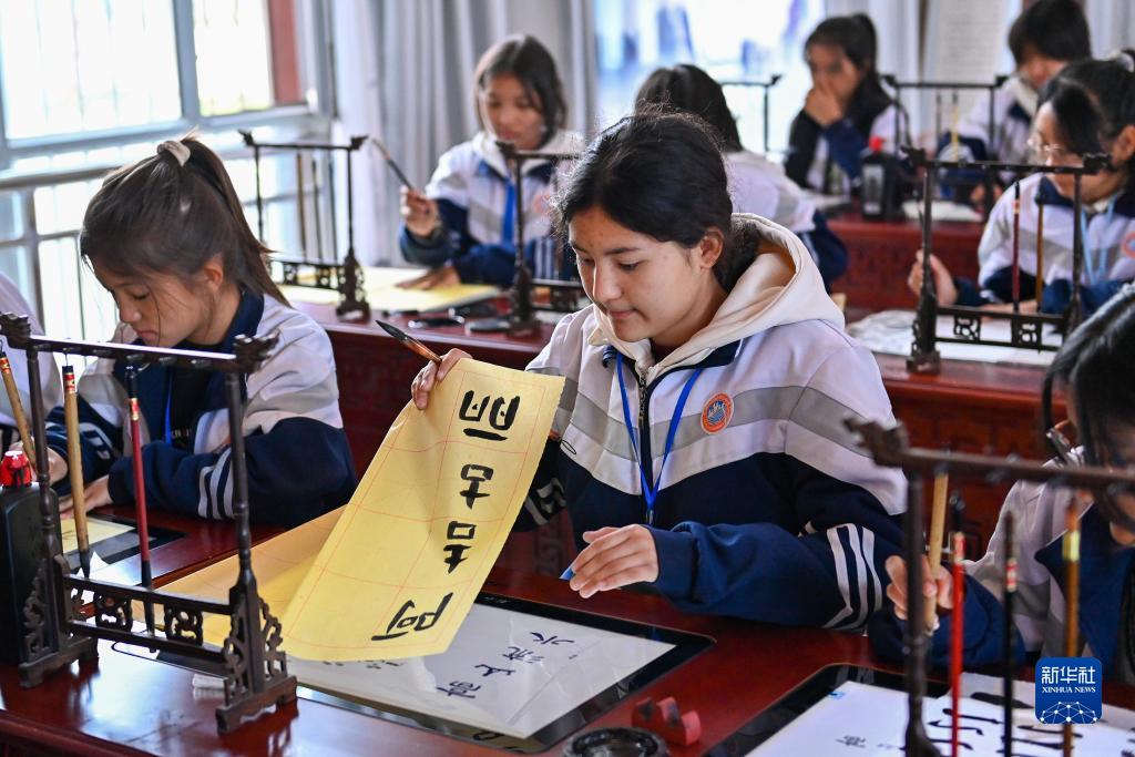 在新疆阿克陶縣雪松中學(xué),“紅杜鵑”書(shū)法社團的學(xué)生在練習書(shū)法(11月7日攝)。