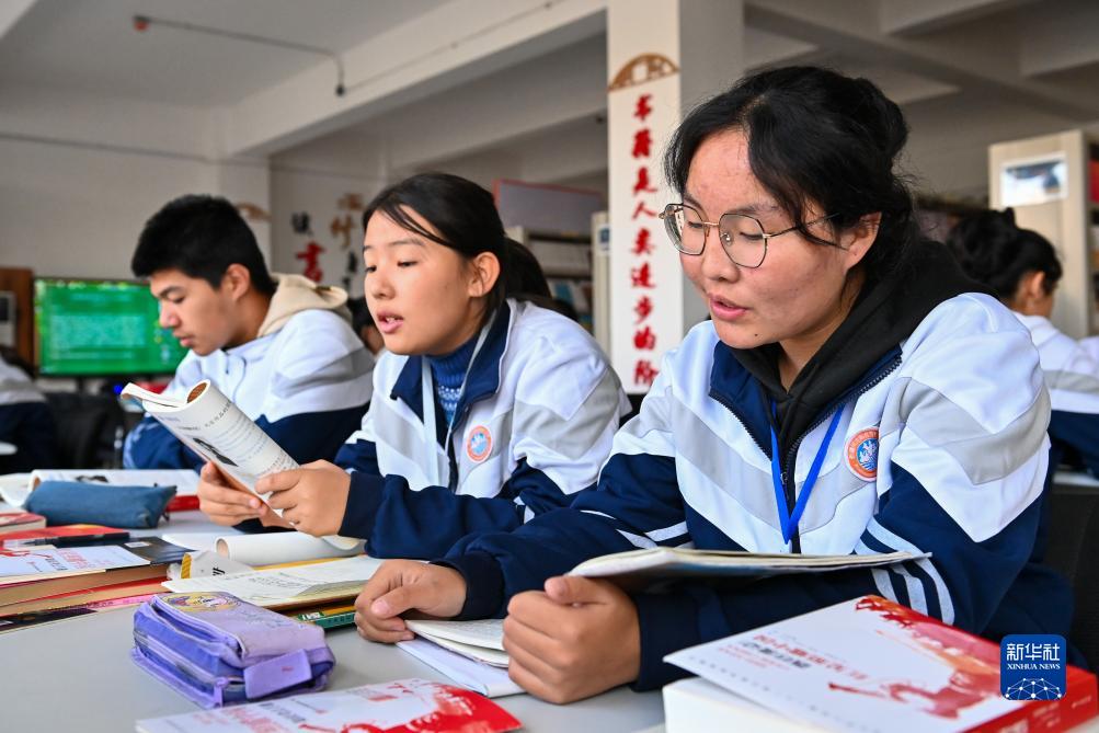 在新疆阿克陶縣雪松中學(xué),“紅杜鵑”誦讀社團的學(xué)生在圖書(shū)館誦讀紅色經(jīng)典書(shū)籍(11月7日攝)。