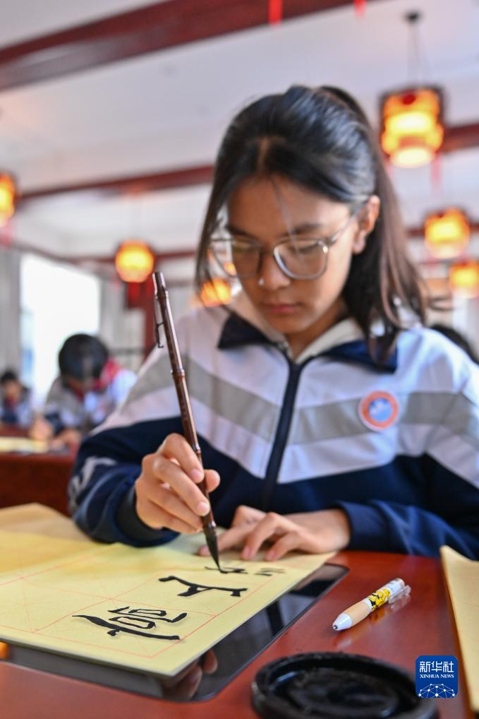 在新疆阿克陶縣雪松中學(xué),“紅杜鵑”書(shū)法社團的學(xué)生在練習書(shū)法(11月7日攝)。