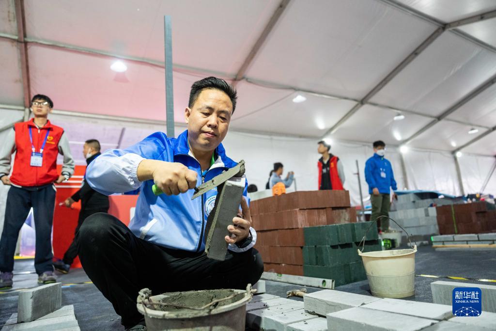 11月8日,在長(cháng)沙賀龍體育中心,參賽選手在進(jìn)行砌筑技術(shù)項目的比拼。