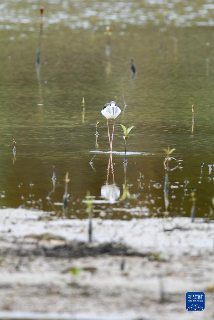 11月8日,一只黑翅長(cháng)腳鷸在海南東寨港(三江灣)生態(tài)修復項目種植的紅樹(shù)林間覓食。