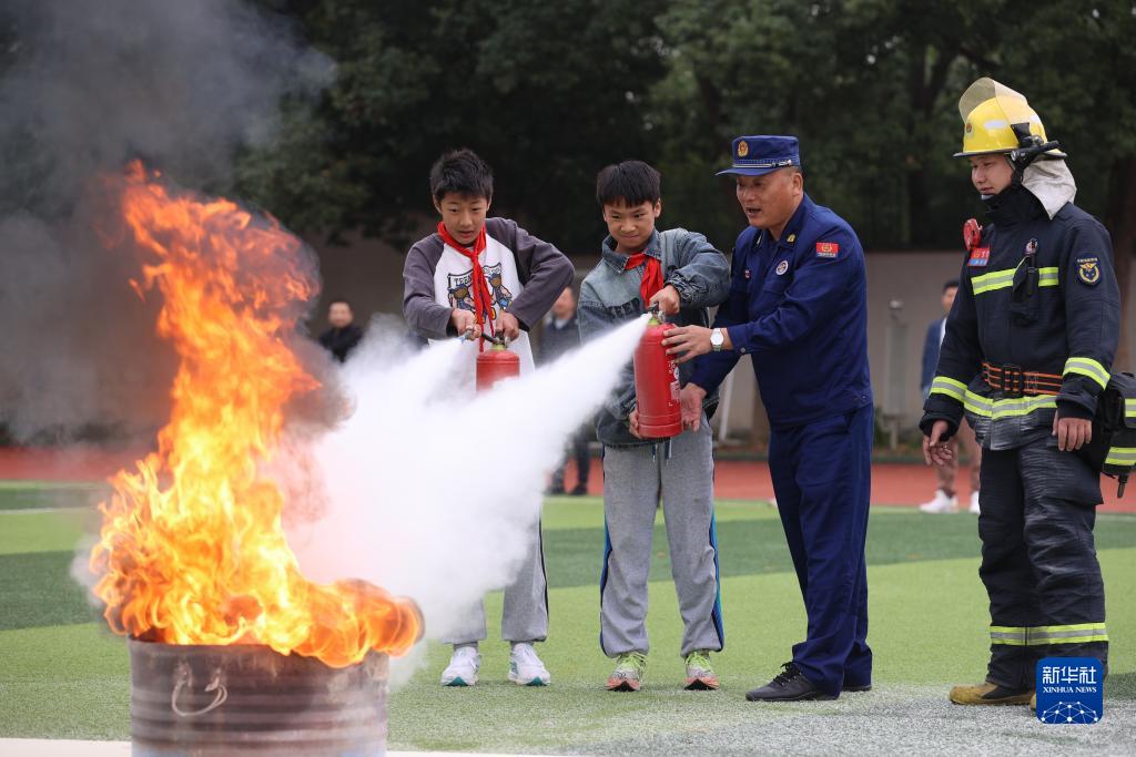 11月8日,在浙江省湖州市吳興區埭溪鎮上強小學(xué),學(xué)生在消防員指導下使用滅火器。