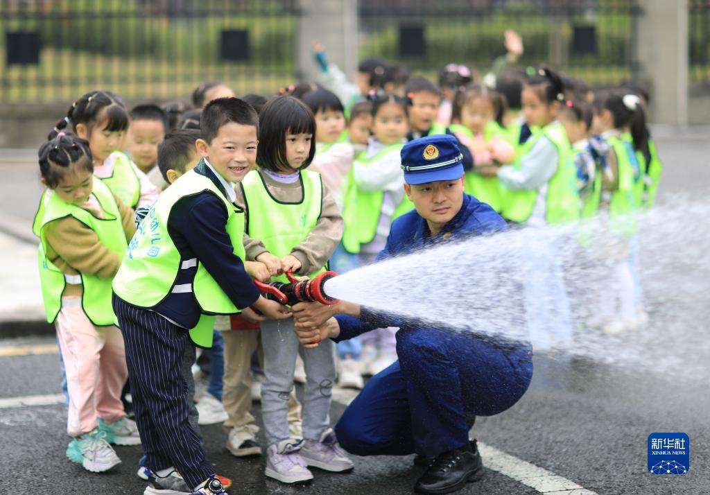 11月8日,在貴州省赤水市消防救援大隊,小朋友在消防救援隊員的輔導下體驗使用消防水槍。
