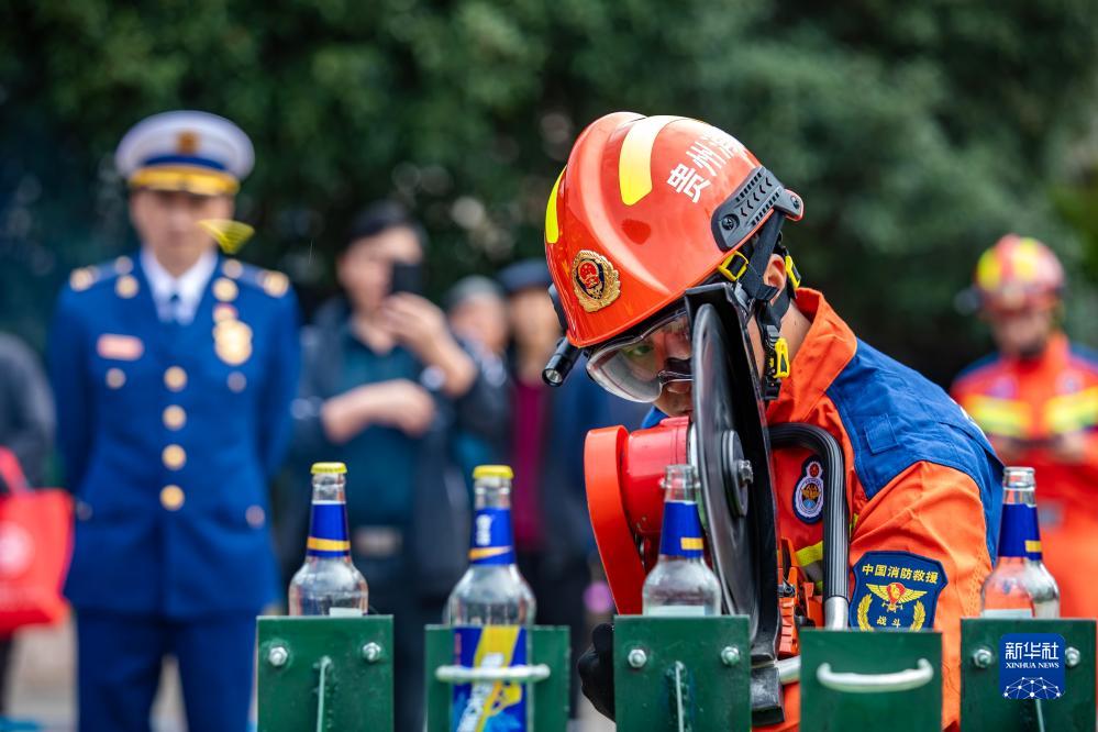 11月8日,在貴州省黔西市水西廣場(chǎng),消防員演示雙輪異向切割機開(kāi)瓶蓋。