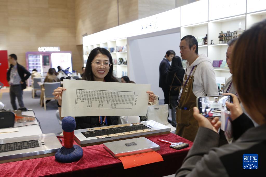 11月8日,在進(jìn)博會(huì )新聞中心,記者在體驗活字拓印。
