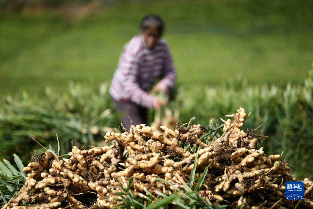 11月8日,村民在貴州省黔西南布依族苗族自治州義龍新區萬(wàn)屯鎮盤(pán)興村收獲生姜。