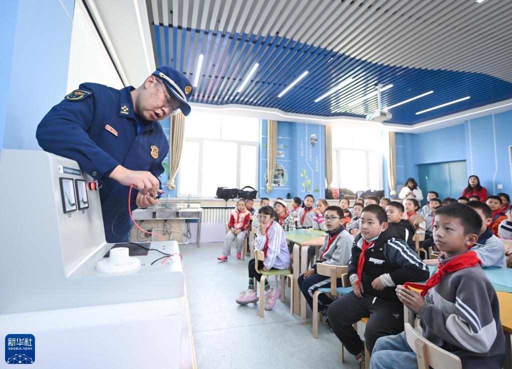 11月8日,西寧市消防救援支隊隊員在西寧市古城臺小學(xué)為小朋友演示電器短路。