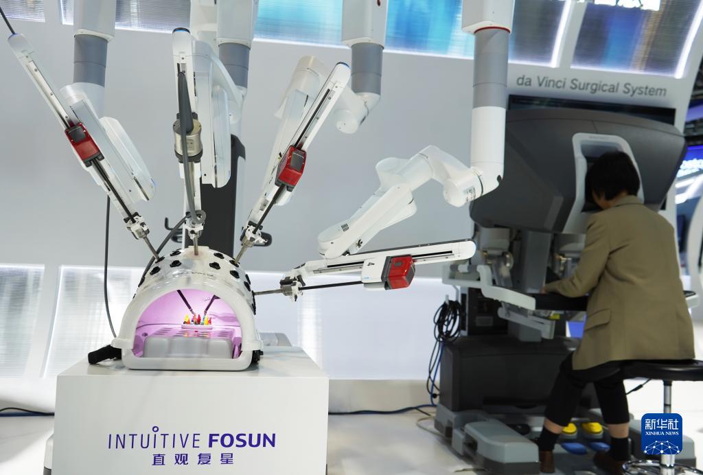 11月7日,在第六屆進(jìn)博會(huì )醫療器械及醫藥保健展區復星健康展臺,工作人員演示操作國產(chǎn)達芬奇手術(shù)機器人。