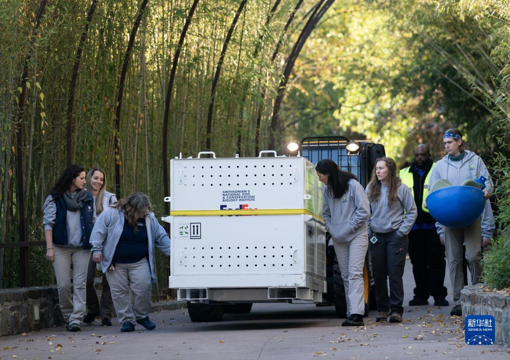 11月8日,在美國華盛頓史密森學(xué)會(huì )國家動(dòng)物園,裝有大熊貓的箱子準備被運往機場(chǎng)。