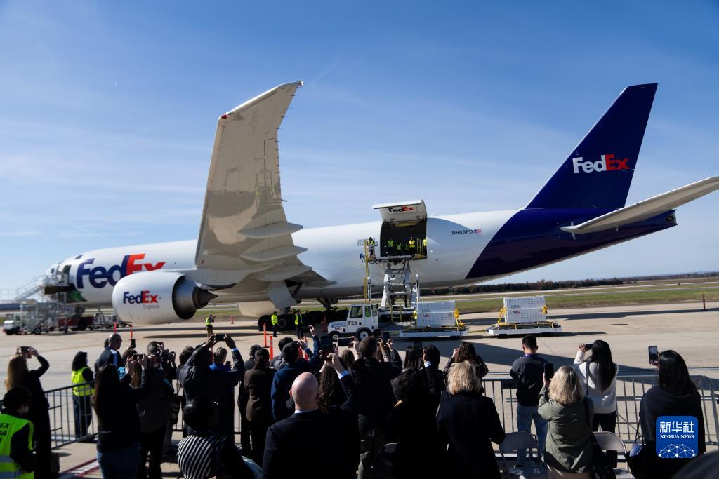 11月8日,在美國弗吉尼亞州的華盛頓杜勒斯國際機場(chǎng),裝有大熊貓的特制“旅行包廂”準備運上專(zhuān)機。