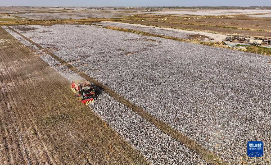 在新疆尉犁縣巴西買(mǎi)里村,農機手駕駛采棉機在爾肯家的棉田中作業(yè)(10月24日攝,無(wú)人機照片)。