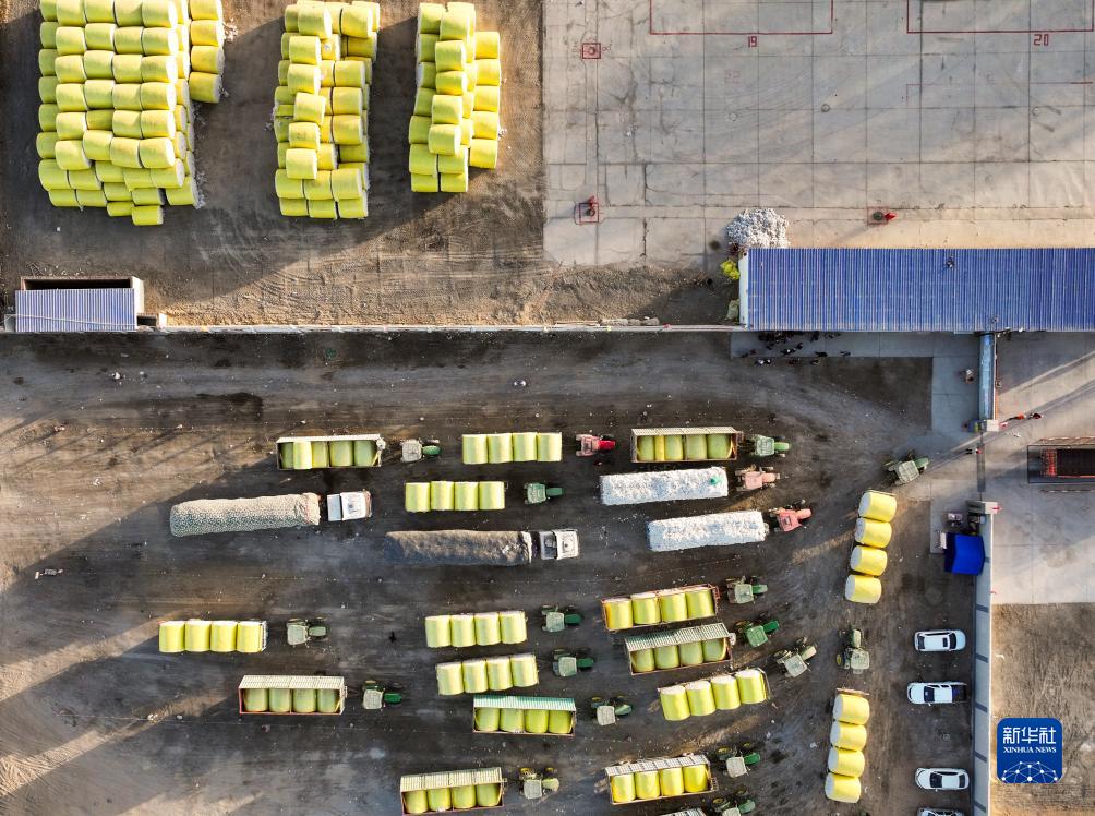 在新疆尉犁縣,棉花加工廠(chǎng)內擺放著(zhù)不少棉包,滿(mǎn)載棉包的車(chē)輛排隊等待進(jìn)廠(chǎng)(11月1日攝,無(wú)人機照片)。