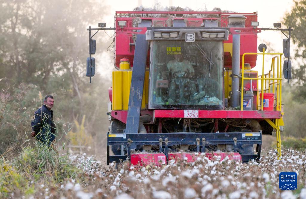 在新疆尉犁縣巴西買(mǎi)里村,爾肯在自家的棉田中查看采棉機作業(yè)(10月20日攝)。