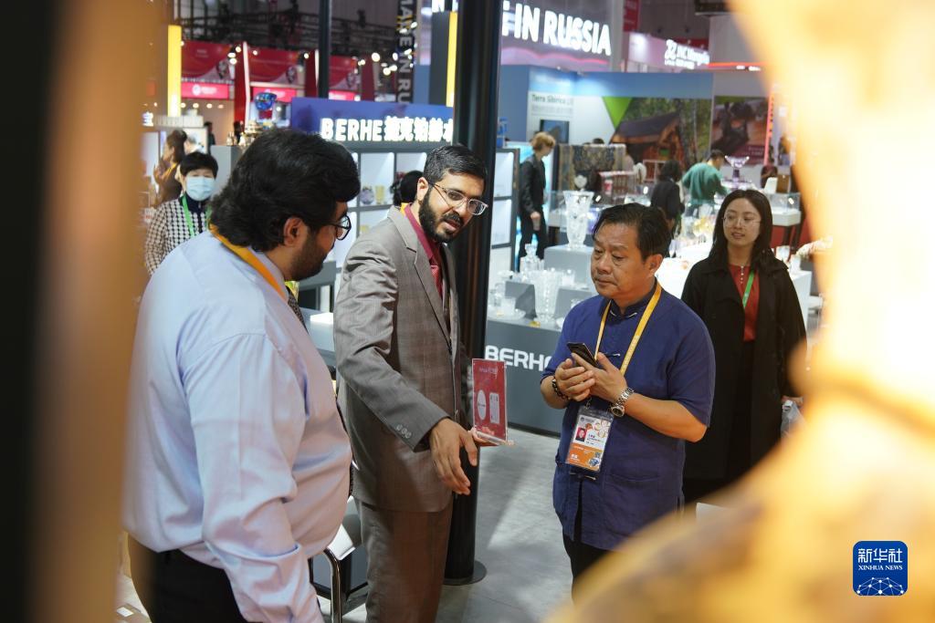 11月6日,在第六屆進(jìn)博會(huì )食品及農展品展區,哈比(左二)向參觀(guān)者介紹駱駝皮燈。
