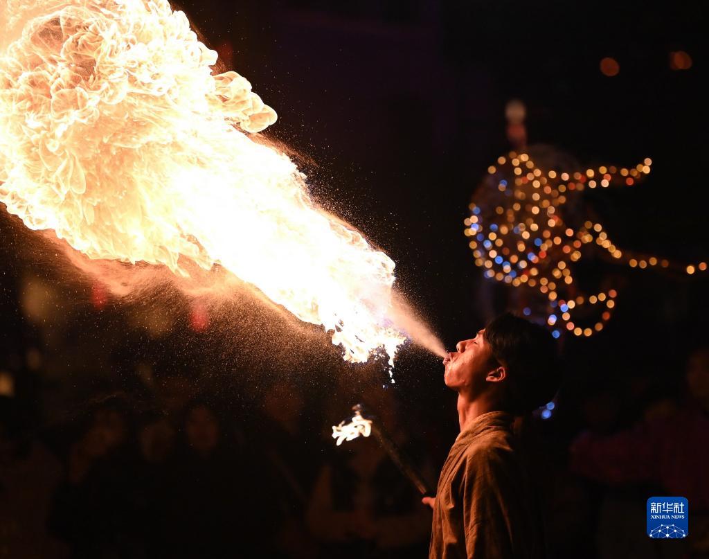 演員在約特干故城表演“噴火”(11月7日攝)。