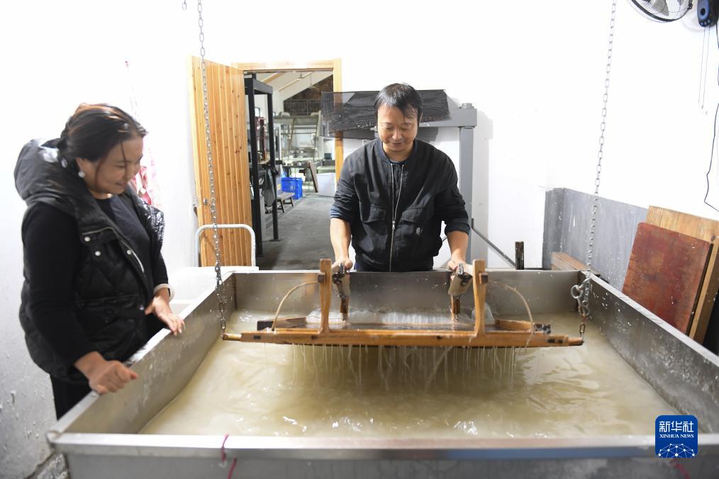 11月9日,黃宏健在開(kāi)化紙傳統技藝工坊抄紙。