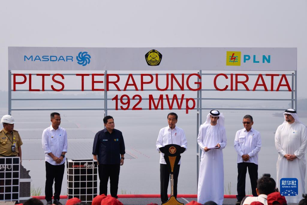 11月9日,印度尼西亞總統佐科(中)在西爪哇省芝拉塔水庫旁出席并網(wǎng)發(fā)電儀式。