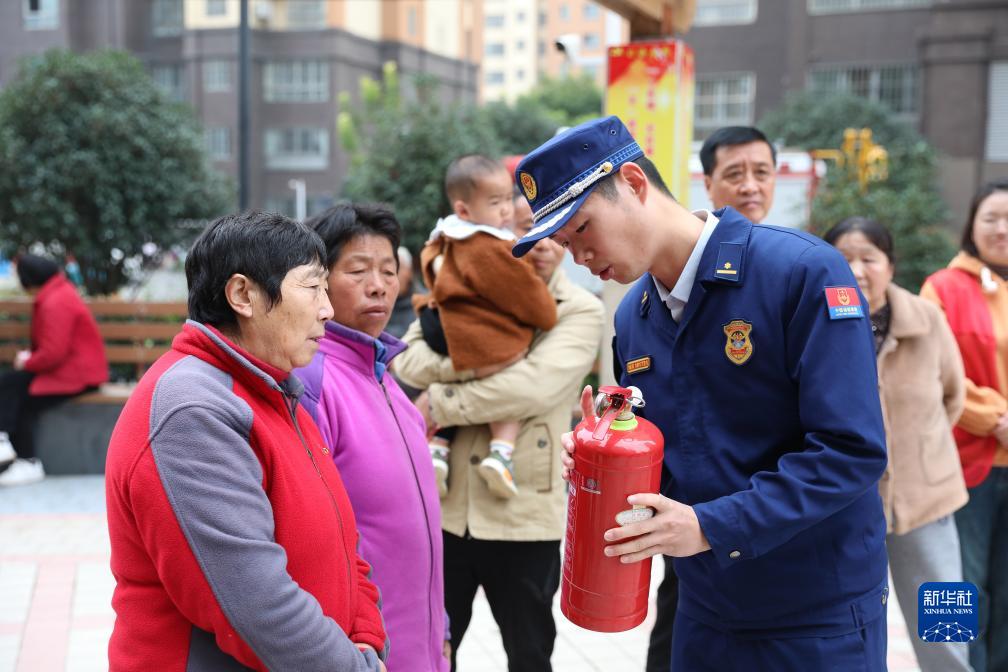 11月9日,在江蘇省淮安市洪澤區高良澗街道潤園小區,消防員為居民講解滅火器知識。