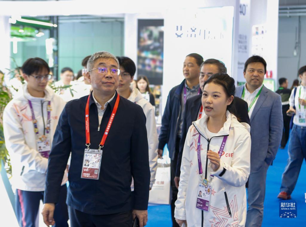 11月7日,在第六屆進(jìn)博會(huì )上,上海理工大學(xué)志愿者吳楊(右)陪同嘉賓參觀(guān)。