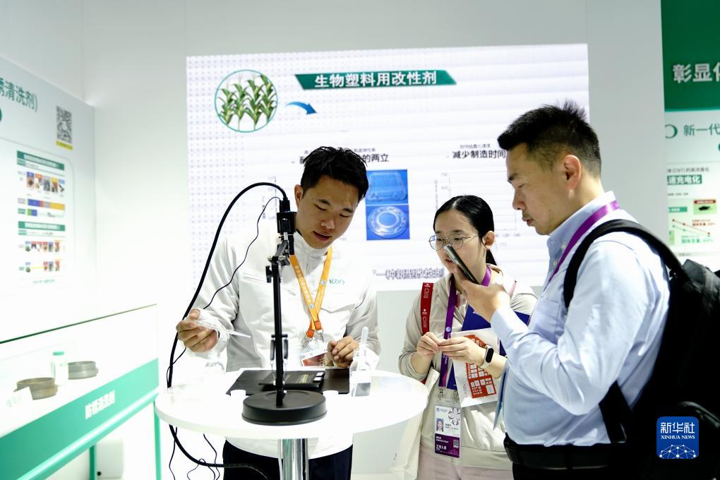 11月9日,在消費品展區花王展臺,工作人員向觀(guān)眾演示環(huán)保產(chǎn)品“生物塑料用改性劑”的效果。