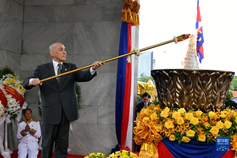 11月9日,在柬埔寨首都金邊,柬埔寨國王西哈莫尼在獨立日慶?;顒?dòng)上點(diǎn)燃獨立紀念碑的“勝利之火”。